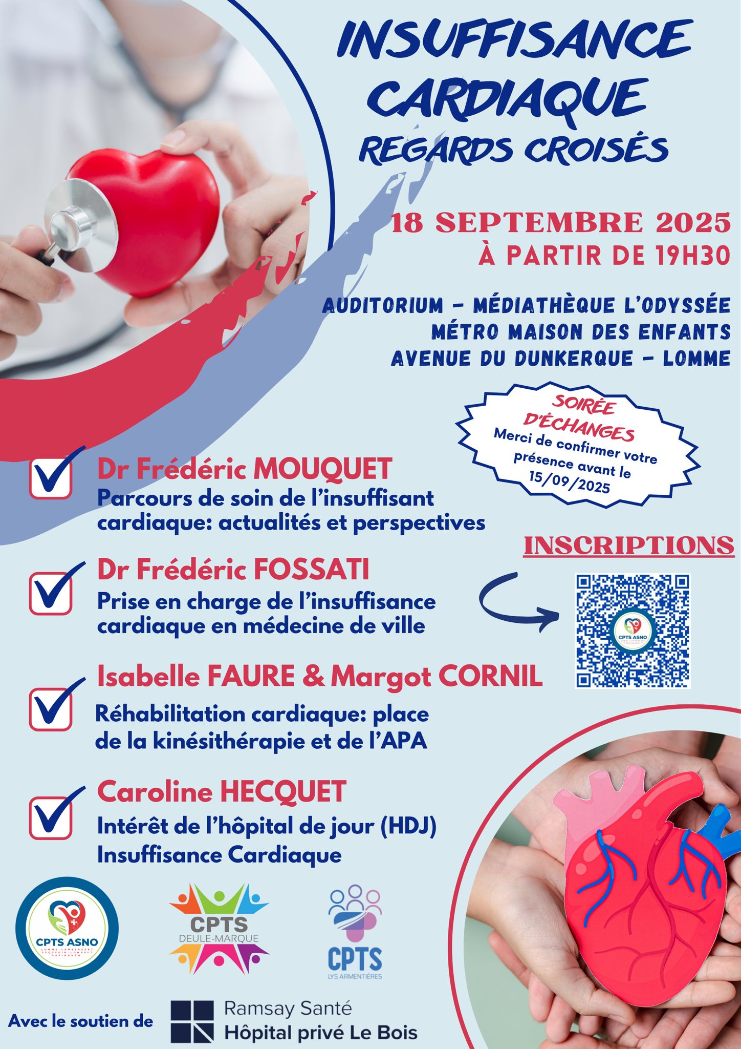Les CPTS Deule Marque , CPTS ASNO, CPTS Lys Armentières et l’Hopital du Bois vous proposent une soirée d’échanges type EPU, sur la thématique de l’Insuffisance Cardiaque :